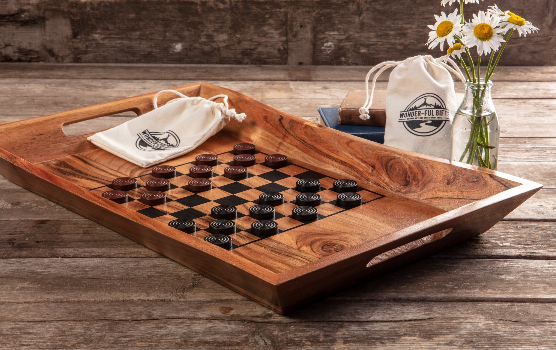 Acacia wood serving tray with checker/chess board on top